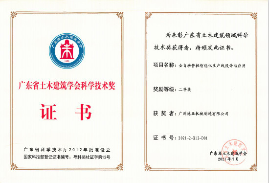 2021年8月20日,第九屆廣東省土木建筑學(xué)會(huì)科學(xué)技術(shù)獎(jiǎng)優(yōu)秀項(xiàng)目技術(shù)交流會(huì)在廣州召開,我司總經(jīng)理雷德意先生應(yīng)邀出席了會(huì)議。會(huì)議上揭曉了2021年廣東省土木建筑學(xué)會(huì)第九屆科學(xué)技術(shù)獎(jiǎng)獲獎(jiǎng)項(xiàng)目,我司的“全自動(dòng)管樁智能化生產(chǎn)線設(shè)計(jì)與應(yīng)用”項(xiàng)目獲得廣東省土木建筑學(xué)會(huì)科學(xué)技術(shù)二等獎(jiǎng)。